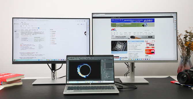 对于很多的白领和内容创作者来讲,外接屏幕的需求可能还要放在首位,毕竟大多数选择笔记本电脑的的尺寸大都在14英寸上下,拓展额外的屏幕可以实现多屏协作提升整体效率,而对于内容创作者来讲,拓展额外的屏幕更加重要了,更多的屏幕可以显示更多的内容,可以一边P图一边找素材,也可以一边做AE动画,一边视频剪辑,效率同样可以实现“翻倍”提升。