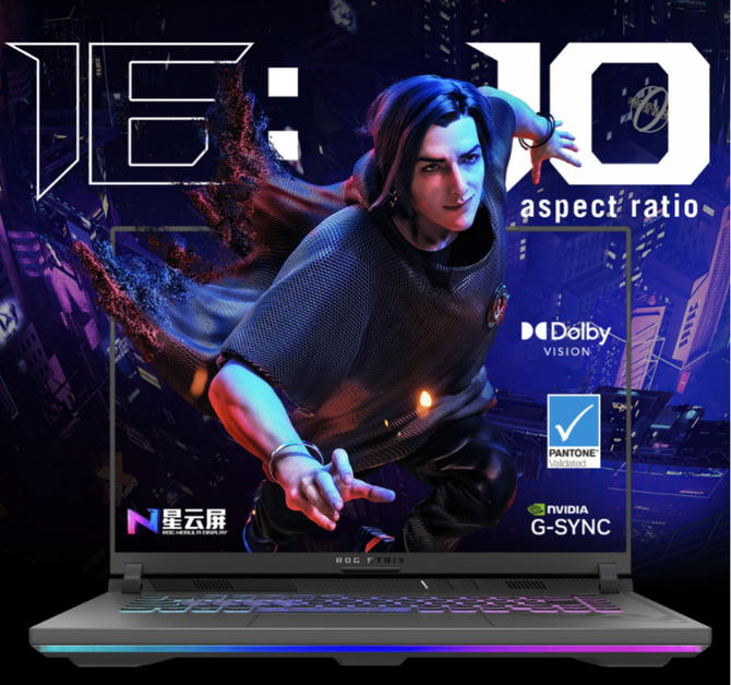 视觉体验上,ROG魔霸新锐2023搭配了一块16英寸IPS广视角星云屏,16:10屏幕比例, 2560*1600分辨率,240Hz刷新率,3ms响应时间,500nits高亮度,100%DCI-P3专业广色域,支持杜比视界,DC调光无频闪,TÜV低蓝光认证。此外还支持色域切换,包括原生、sRGB、DCI-P3、Display P3,可以满足不同应用下的视觉体验。