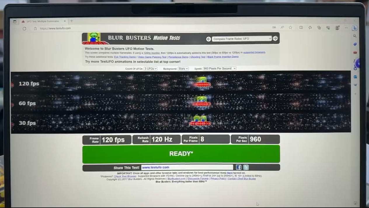 在UFOTest测试平台上,可以很容易识别出来屏幕支持的120Hz刷新率,飞碟的显示除了更加丝滑,也不会出现严重的重影或撕裂现象。