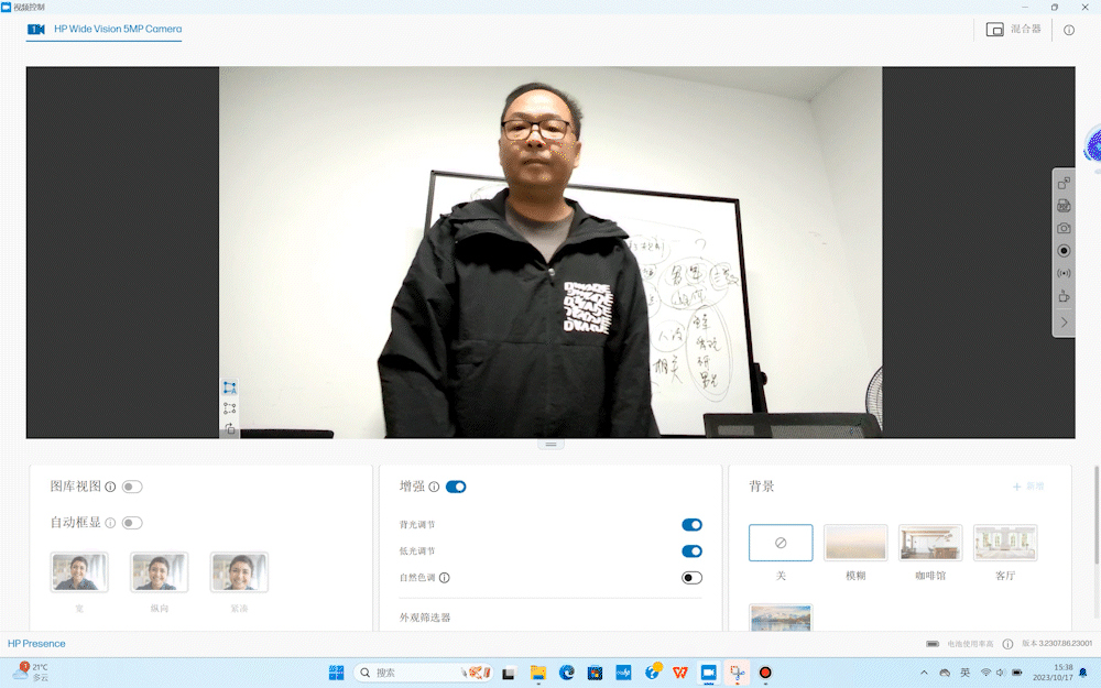 在视频控制面板里,我们可以开启背光调节和低光调节、自然色调等功能,在暗光环境下依旧能够保证画面中人脸清晰,另外还有自动AI框选,保证人物始终居中显示,带来更好的视频会议效果。