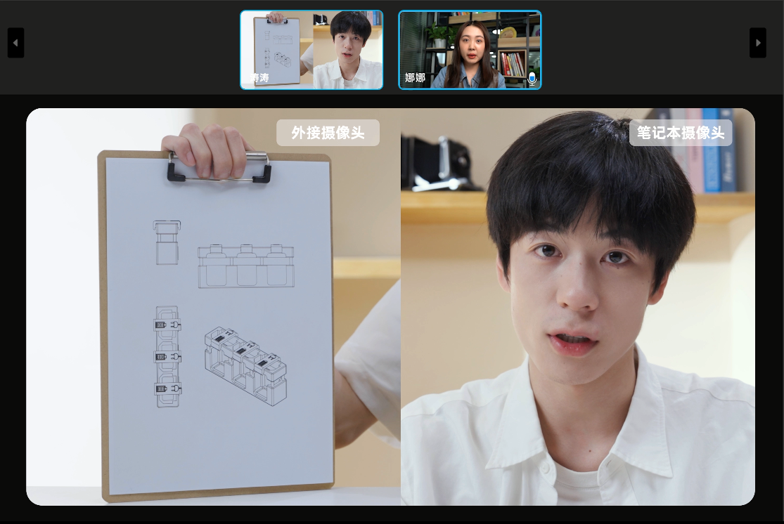 视频控制中心的功能当然不止这么多,在视频画面的左右侧,还有更多其它实用的功能,比如左侧的校正功能,就是针对在使用白板演示时,可以自动校正白板并位于画面中间,呈现更清晰的内容。