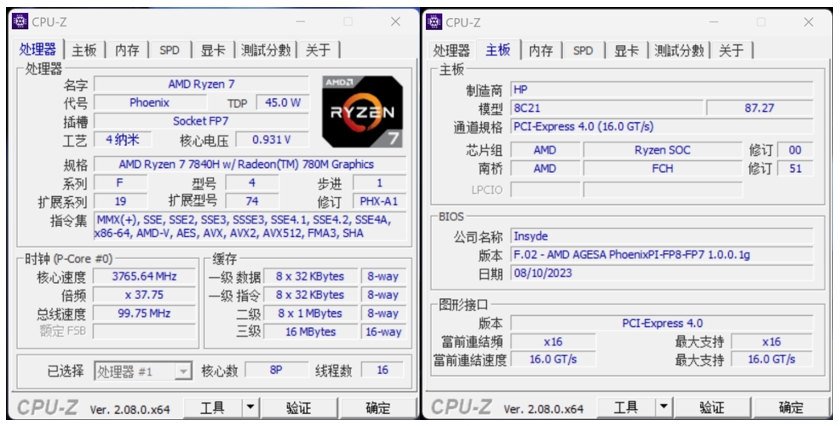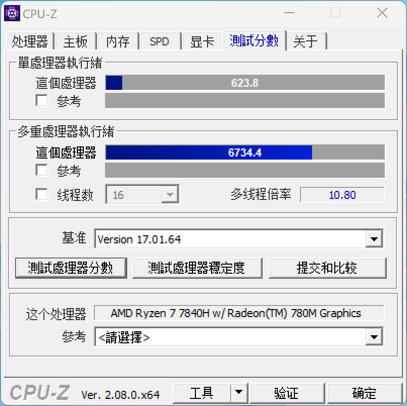 在CPU-Z内置的测试中,锐龙 7 7840H处理器的单核得分为623.8,多核得分为6734.4。与13代酷睿i5-13500H处理器相比,单核成绩落后,但是多核成绩却胜出,所以其在多任务应用下会有出色的表现,比如视频剪辑、同时打开多个页面、PPT等。