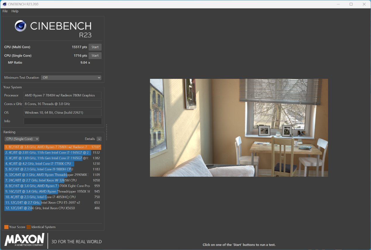 CINEBENCH常用于评估CPU和显卡的硬件性能,其优化的测试流程能够反映CPU和渲染技术的整体进步,为Cinema 4D利用多个CPU核心以及现代CPU功能提供了更准确的测量。结果可见,锐龙 7 7840H处理器在CINEBENCH R23上的单核成绩为1776,多核成绩为15517。相比酷睿i5-13500H处理器的这一测试成绩,多核成绩继续胜出。