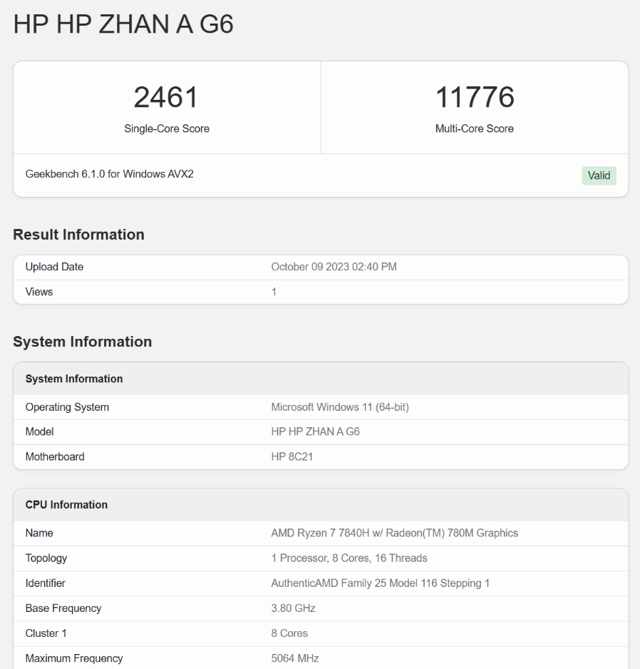 Geekbench能够通过实用的日常场景和数据集来衡量处理器性能,并给出CPU单核、多核成绩,也是目前比较常用的CPU性能跑分平台。测试结果可见,锐龙 7 7840H处理器在Geekbench 6上的单核成绩为2461,多核成绩11776。