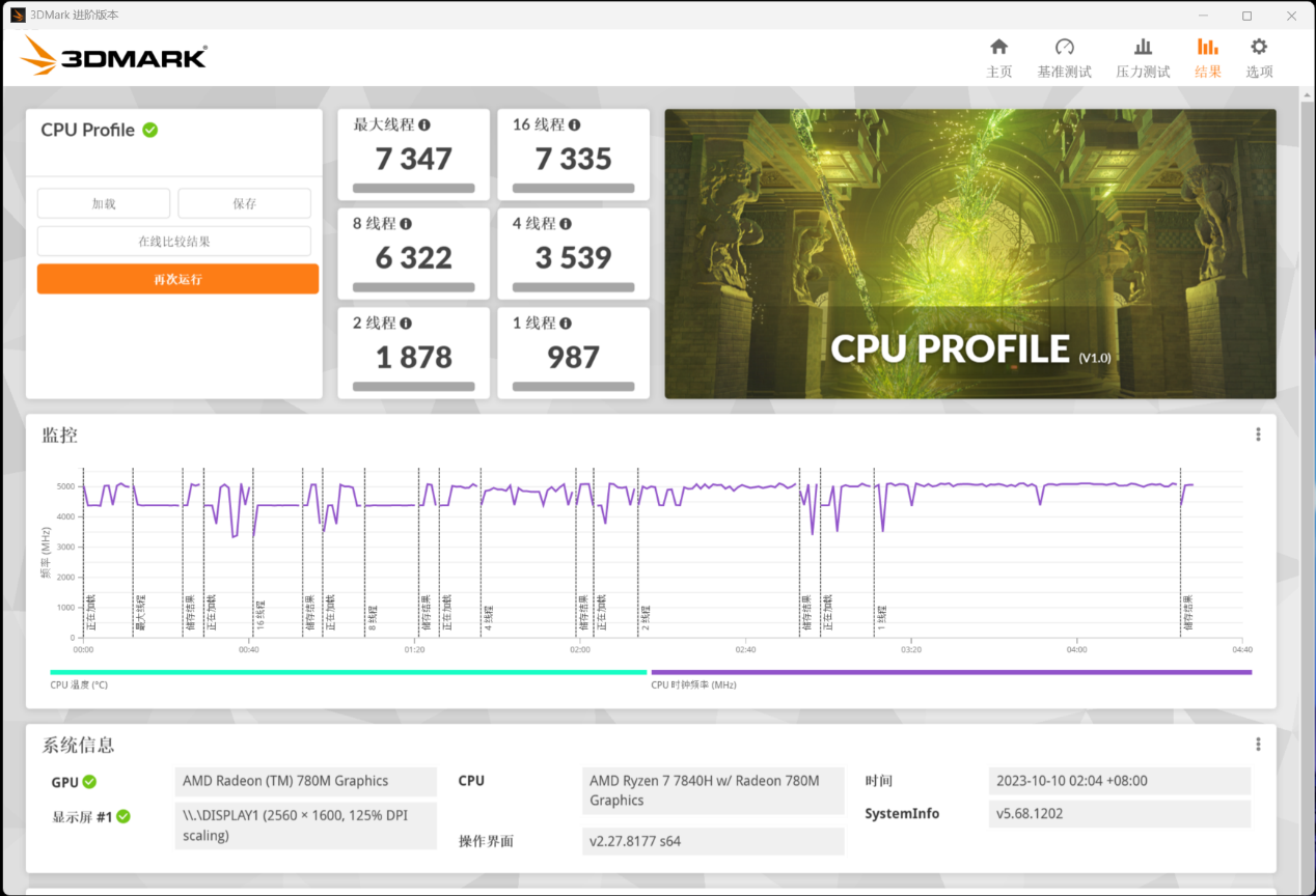 3DMark CPU能够评估CPU各个线程的性能表现,并分别给出成绩,此外监控曲线也体现了CPU的稳定性。结果可见,锐龙7 7840H处理器的最大线程得分7347。