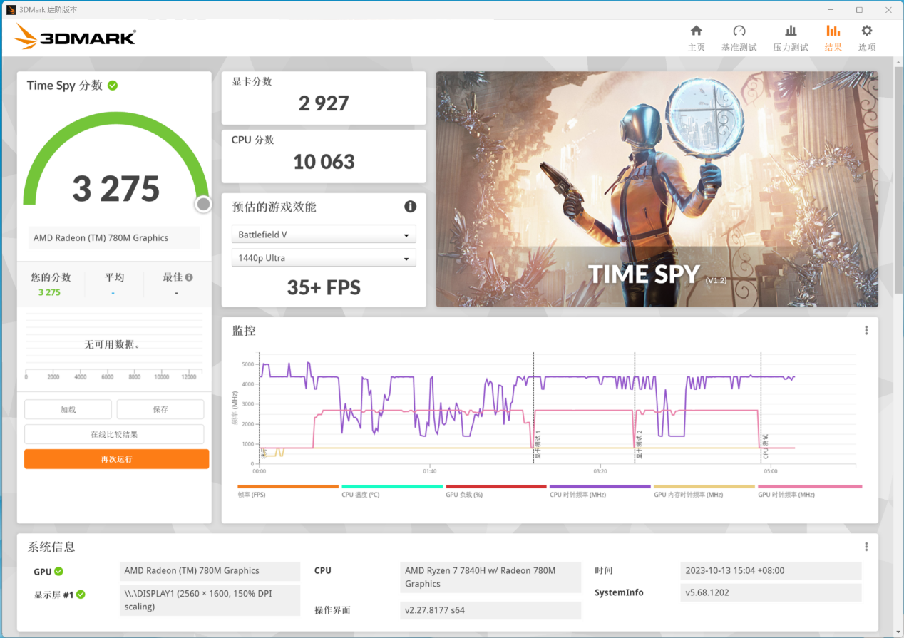来看看其在3DMark上的理论测试成绩,Time Spy测试,显卡得分2927,综合得分3275。