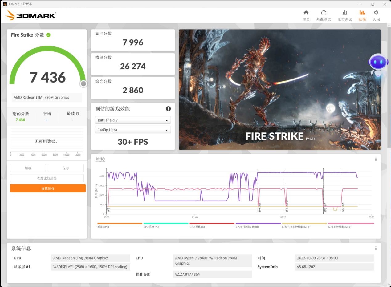 Fire Strike 的测试中,显卡得分7996,综合得分7436。