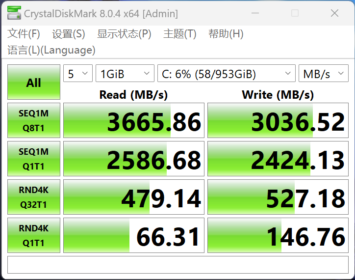 来看看这块SSD的性能,使用CrystalDiskMark测试,顺序读取速度为3665.86 MB/s,写入速度为3036.62 MB/s,完全可以满足大文件的copy需求。
