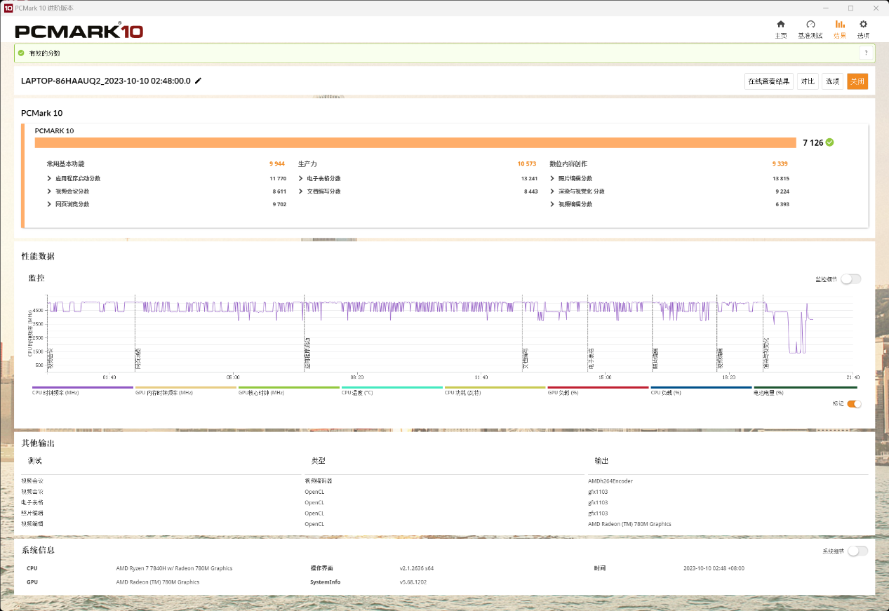 PCMark 10 可以测试PC的综合性能并针对每个项目进行打分,包括常用基本功能、生产力、数位创作、游戏等,每个项目下还有细分的类。结果可见,常用基本功能的得分为9944;生产力得分10573;数位内容创作得分9339。测试的成绩相对比较均衡,也意味着惠普锐Pro 14锐龙版可以轻松胜任各种办公应用。