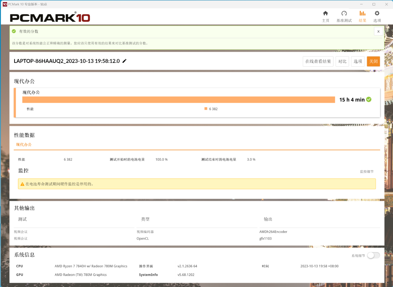 我们再使用PCMark 10来实测一下,也许更加直观,满电100%,系统电源模式为最 佳能效,屏幕亮度40%,无线、蓝牙等保持连接,这样可以满足正常的办公使用,而且整个测试的过程实际上比我们日常办公的负载要更大。最终的结果也可见,15小时4分钟的续航,已经不止满足一整天的办公需求了。