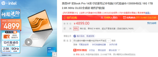 现在正值双十一的爆发期,基本所有品类商品的促销活动都已经放出来了,可以说是出手的最 佳时机。对于有办公需求的小伙伴,可以考虑这款不到5K的顶配高效生产力工具——惠普星Book Pro 14轻薄本,13代标压处理器、1TB大容量SSD、高分高刷OLED屏幕、500W摄像头,几乎所有配置都已经达到轻薄本的天花板级别,对于正处在职业上升期的你来说无疑是最大的帮手,双十一期间仅需4899元,并且晒单还送百元京东E卡,可谓折上折了。