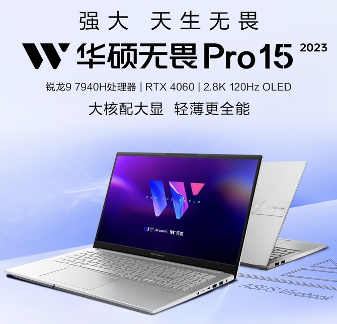 华硕无畏Pro15定位轻薄全能本,所以在硬件上,搭载了全新“Zen 4”架构打造的AMD锐龙9 7940H移动处理器,同时还配备了RTX 4060光追独显,为创意设计软件提供显卡加速,非常适合有渲染、剪辑等专业应用需求的朋友们选择。无畏Pro15整机性能释放达到85W,为处理大型任务提供充足动力,无论是图形设计、视频编辑还是3A游戏都能轻松应对。