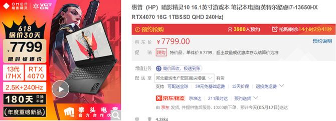 不得不说OMEN暗影精灵10将i7+RTX4070配置拉到8000元以内是非常劲爆的,仅7799元就能够拥有一台可以畅玩所有光追游戏的游戏本,并且还拥有优秀的屏幕及强大的散热系统。而且现在OMEN暗影精灵全系游戏本在京东自营店,除了超值特价外还享受180天只换不修服务,绝 对是618期间的爆款游戏本,值得玩家拥有。