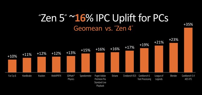与上一代相比,AMD Ryzen 9000 系列前端的指令带宽, L2 到 L1 以及 L1 到 FP 的数据带宽,以及 AI 性能方面,AI 和 AVX512 的吞吐量,均有 2 倍的提升。同样,对比Zen 4架构,Zen 5桌面级平台在 IPC 上的提升也十分出色,游戏《孤岛惊魂6》的提升约10%,Cinebench R23的提升达到了19%,而 Geekbench 5.4 AES XTS 加密算法的跑分更是提升35%。