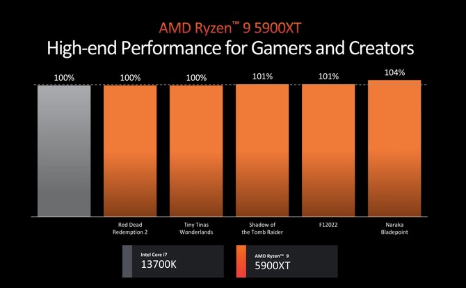 更新后的锐龙9 5900XT在跟酷睿i7-13700K对比时,《荒野大镖客:救赎2》等游戏的成绩水平相当,但是《永劫无间》的成绩则高出4%,可以说是旗鼓相当。