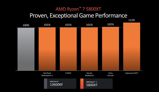 而锐龙7 5800XT则对比酷睿13600KF处理器,游戏性能方面,《赛博朋克2077》的提升明显,可达12%。