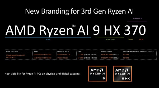 另一个锐龙AI 9 365处理器同样定位高端型号,拥有10核心20线程,二级缓存10MB,三级缓存仍为24MB,最 高频率5.0GHz。GPU为Radeon 880M,12个CU单元,NPU算力50TOPS保持一致。两个型号的处理器TDP热设计功耗都是18W,可调范围18~54W。相信大家也发现了,这次的新品在命名规则上也有所变化,通过名称和型号可以看到,Ryzen AI是凸显 AI 属性,数字 9 依然是该系列的顶 级型号,值得一提的是,“HX”代表品牌级别,但它并不表示芯片消耗多少瓦的功率。相反,HX将简单地指“堆栈顶部”或最 好和最 快的Ryzen AI 300芯片。也就是说我们依然可以通过数字大小来区分各个型号的性能。