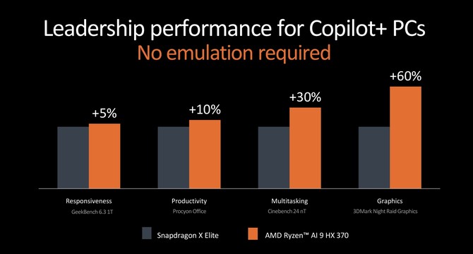 系统层面,微软也宣布将在全新的Windows系统中,默认内置Copilot,而新一代AI PC也被赋予了Copilot+PC的全新定义。在响应速度、生产力、多线程以及图形性能方面,Ryzen AI 9 HX 370对比高通骁龙X Elite平台也有更好的表现,其中多线程性能和图形性能优势显著,分别高出30%以及60%以上。