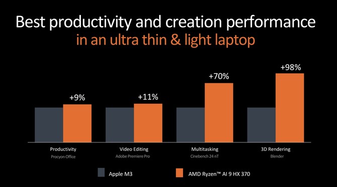 在轻薄本上的生产力和创作性能,对比苹果M3处理器,Cinebench 24 nT多任务处理的成绩高出70%,而Blender 的3D渲染更是高达98%。