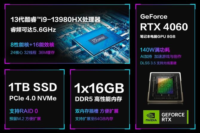 硬件配置方面,ROG魔霸新锐搭载了旗舰级的酷睿i9-13980HX处理器,睿频可达5.6GHz,在ROG优化下单烤可达135W,毫无疑问是性能玩家的首选利器。显卡方面,搭配了GeForce RTX 4060笔记本电脑GPU,在独显输出模式下可实现140W满功耗性能释放,支持光追和DLSS 3.5技术,8GB显存也可以轻松应对3A大作或生产力需求。