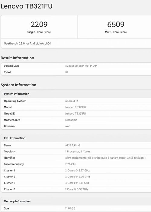 近日也有消息显示,联想新机 TB321FU 的跑分已经在 GeekBench 6 官网显示,搭载的骁龙 8 Gen 3 处理器,12GB RAM,单核 2209 分、多核 6509 分。