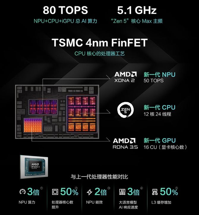 硬件方面,天选锐龙AI版搭载了AMD第三代AIPC处理器锐龙AI 9 HX 370处理器,基于“Zen5”架构、TSMC 4nm FinFET制程工艺打造,12核心24线程,最 高加速时钟频率5.1GHz,L2+L3缓存为 36MB,可配置热设计功耗 (cTDP)为15-54W,性能十分强劲。此外,全新的XDNA2架构NPU算力达到50 TOPS,在CPU、iGPU的加持下,总 AI 算力可达 80 TOPS,并支持Windows系统级AI,为玩家带来更加疾速、智能的 AI PC体验。