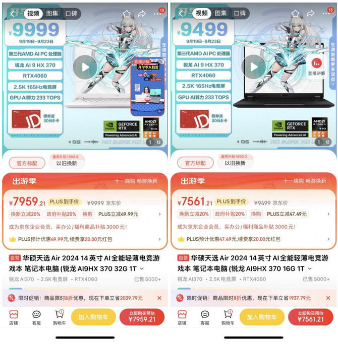 锐龙AI 9 HX 370 + 16GB + 1TB SSD,2.5K 165Hz,售价 7561元,【购买链接】