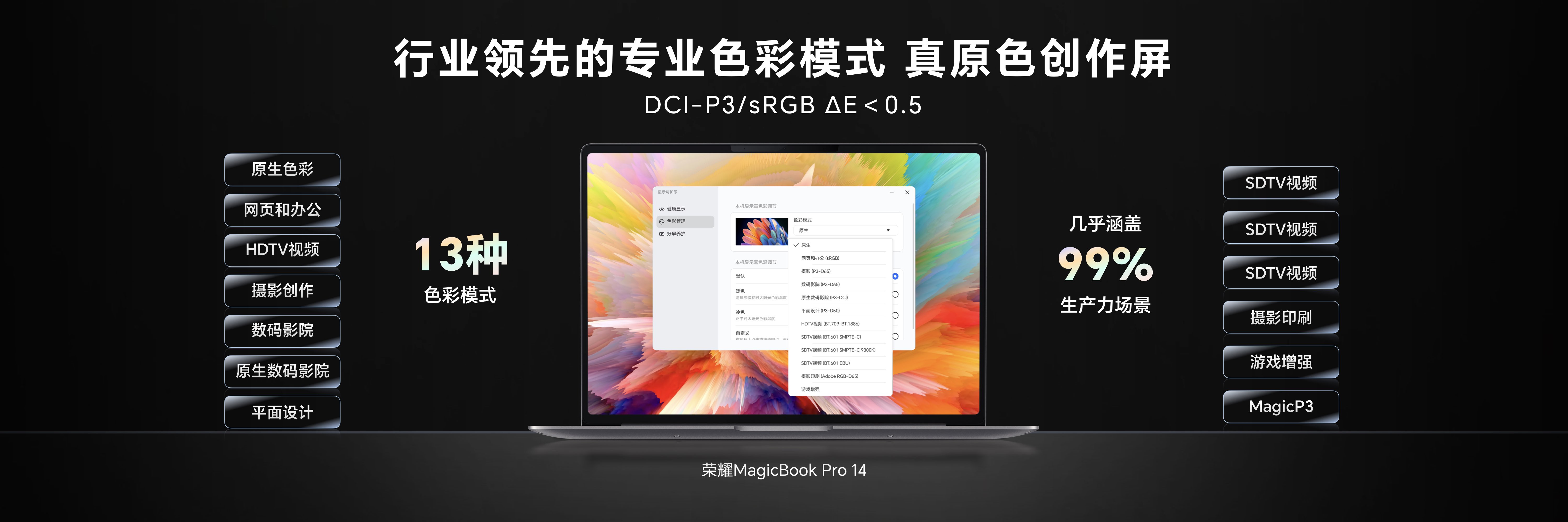 荣耀MagicBook Pro 14配备14.6英寸3120*2080分辨率OLED旗舰级触控好屏,支持多达13种专业色彩模式,可涵盖网页和办公、摄影创作、平面设计等99%的生产力场景,带来极致的真原色创作体验。
