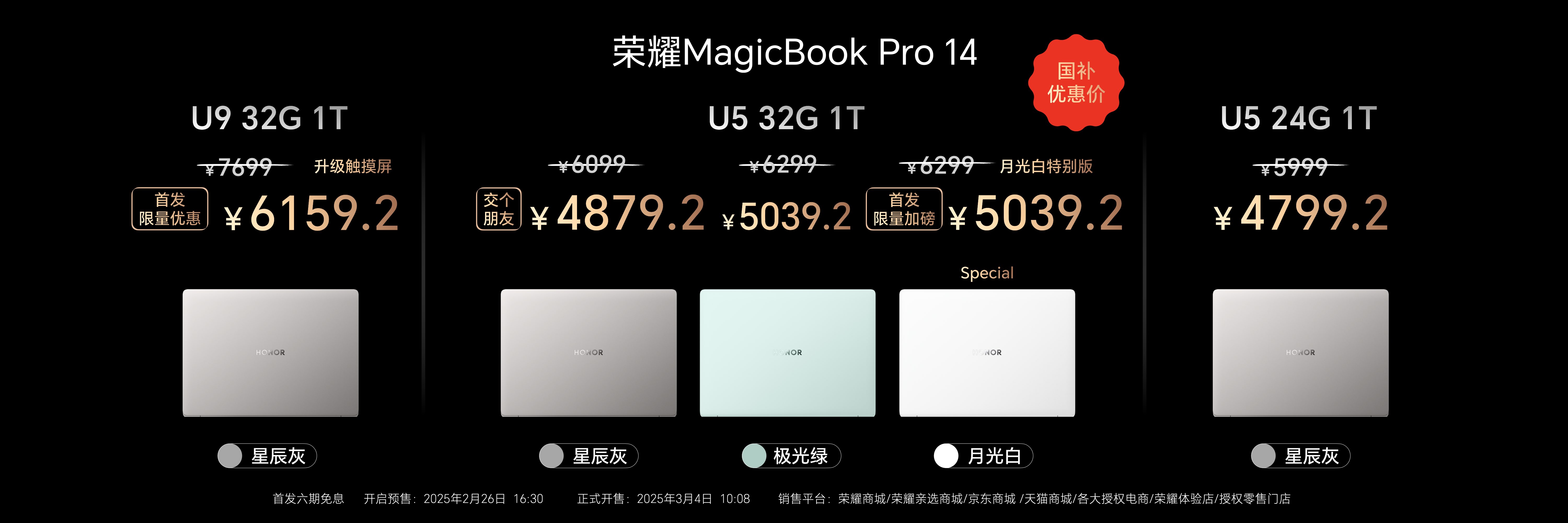 荣耀MagicBook Pro 14为消费者提供多种配置选择,Ultra5+24GB+1TB国补到手价4799.2元,Ultra5+32GB+1TB国补到手价4879.2元,Ultra9+32GB+1TB触控屏版到国补手价6159.2元,于2月26日16:30开启预售,3月4日10:08正式开售。