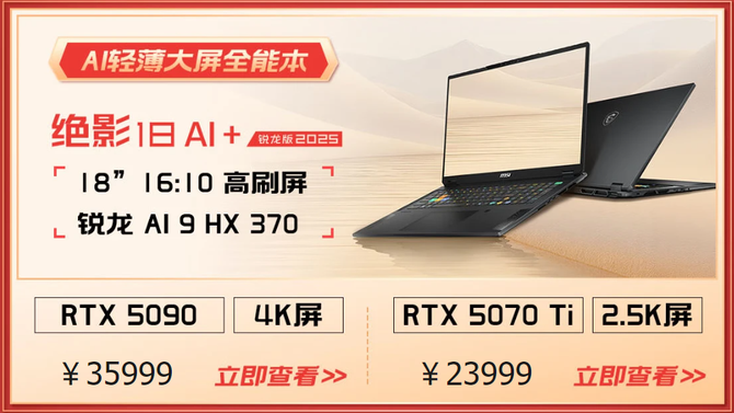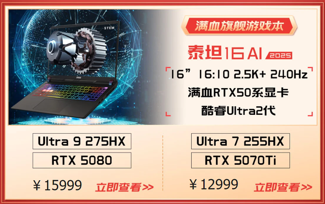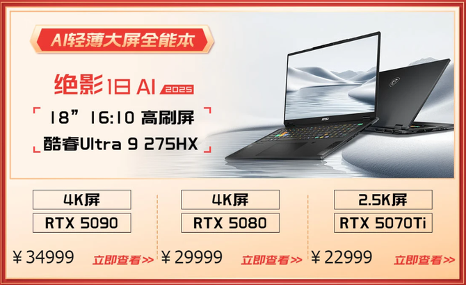 当然,51专属好礼足够丰富,更重要的爆款单品也能满足不同玩家的需求:除了微星旗舰机皇的泰坦18 Ultra/Pro AI 2025,堪称旗舰性价比的泰坦16/17 AI 2025竞争力也是十足,AMD平台高性能游戏本也有雷影18 2025/泰坦18 Pro 锐龙版 2025坐镇,喜欢轻薄全能属性的朋友,当然也少不了绝影系列,同样提供Intel/AMD双版本,16/18英寸不同尺寸可选!