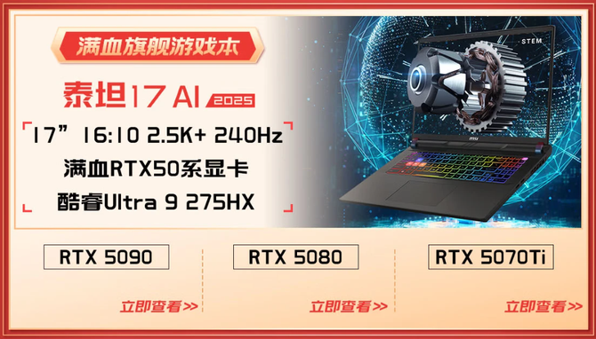 对于更需求沉浸感的玩家,泰坦17 AI 2025则提供大屏选择,当前RTX5070Ti、RTX5080版本都开启预购;未来更有顶配的RTX5090版本,给选购游戏本的玩家们更多选择!