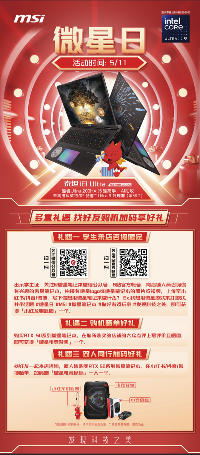 当然,您以为这样就结束了吗?并没有!51假期过后,5月11日,微星笔记本还带来了品牌日的线下活动,同样精彩!涵盖了学生来店咨询打卡赠送限定礼品、购机晒单赠送微星电竞背包、双人同行还有加码好礼等三重礼遇。