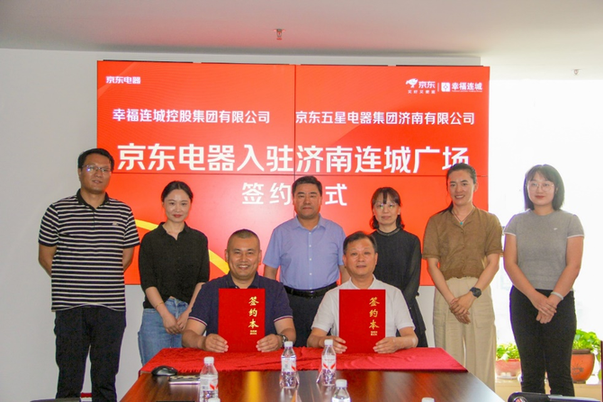 5月20日,京东电器城市旗舰店济南连城广场店举行签约仪式,京东电器在济南布局的第三家城市旗舰店正式落户槐荫区。项目计划在今年下半年开业。振兴街街道党工委书记陈冠华、振兴街街道便民服务中心主任刘晶、振兴街街道经发办主任李鹏飞 ,幸福连城控股集团董事长陆建林,济南京东电器相关负责人共同出席活动。