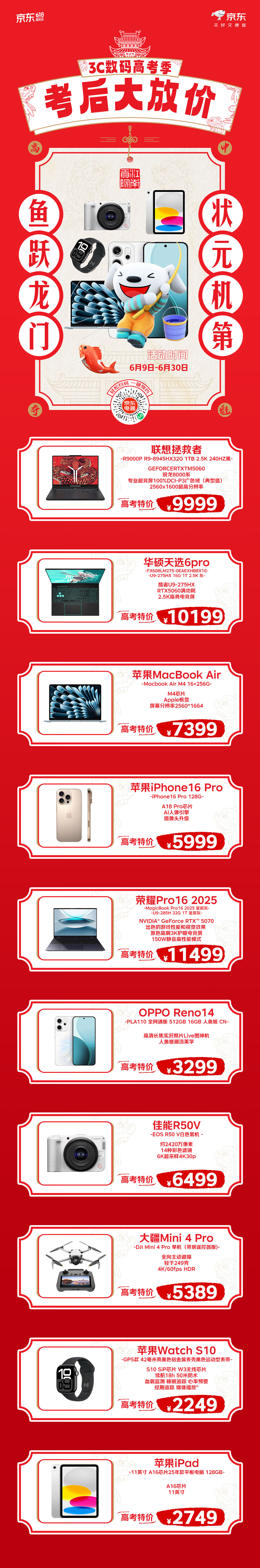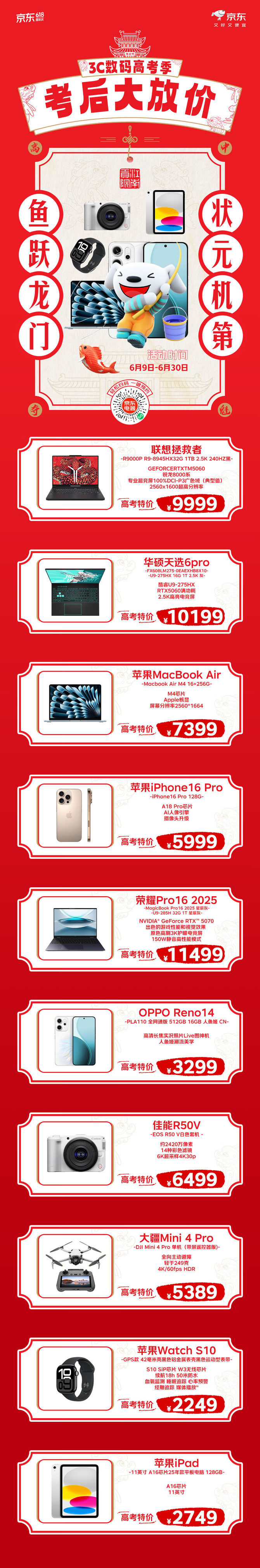 今天全国多地高考结束,金榜题名的祝福从四面八方涌来,考场外陪考的家长们也在讨论起孩子们的成人礼。电子产品、毕业旅行、驾校报名、同学聚会等“考后消费”也火热起来。6月9日起,京东电器城市旗舰店、京东MALL等京东自营门店联合华为、苹果、联想、大疆、任天堂等一线手机数码品牌,以及西昊电竞椅等品牌,推出3C数码高考季“考后大放价”活动,凭准考证到店可享热门机型高考特价优惠立减。京东DIY装机大师还可以根据学生的需求个性化定制电脑。部分产品还可根据各地政策,叠加享受手机、平板、智能手表、电脑“国补”15%-20%优惠。