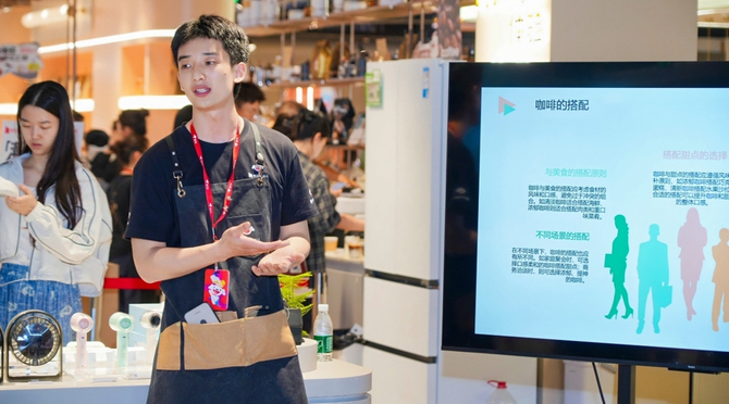 在京东MALL咖啡体验区,张先生和妻子边听体验官讲解,边试喝不同咖啡机做出的口感,心满意足地拿下一台德龙R5全自动咖啡机。