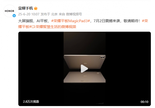 6月20日,荣耀宣布AI旗舰平板MagicPad 3,将于7月2日在荣耀Magic V5暨AI终端生态发布会上亮相。荣耀平板MagicPad 3搭载13.3英寸165Hz超高刷护眼屏和12450mAh最大容量电池,并首发全新AI生产力解决方案,带来大有不同的AI平板新体验。