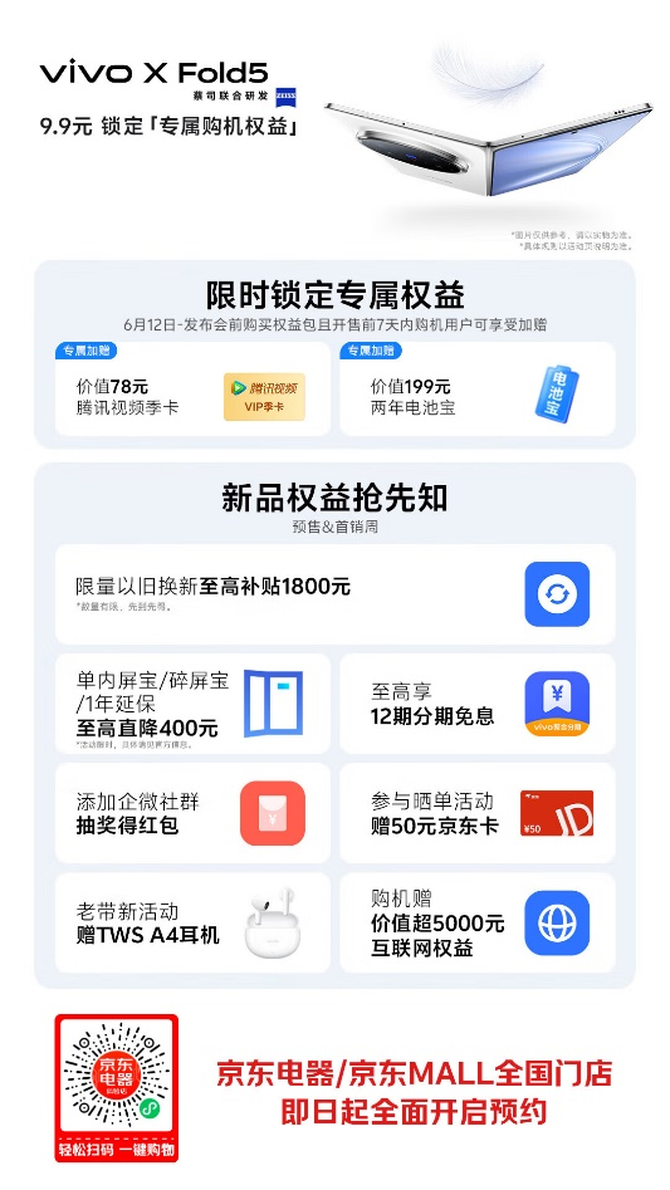 vivo X Fold5将于7月2日现货开售,京东MALL、京东电器全国线下门店样机已到店体验,同步开启新机预约,首发购机享以旧换新至高补贴1800元等7大权益。全国24家京东MALL作为vivo的TOP级销售渠道,获得“限量先享购机”权益,第一批顾客已于6月26日优先购机,粉丝热情高涨。