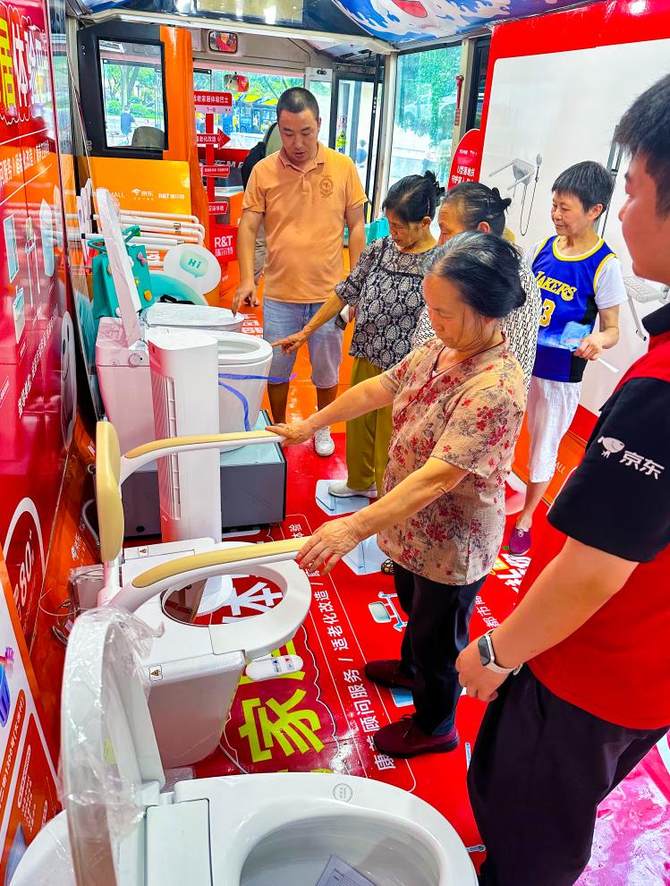 在活动现场看到,京东电器将普通公交车进行精心改造,体验巴士化身为“移动的适老生活体验馆”。巴士内以生活化场景布置,集中展示智能马桶、智能门锁、厨卫电器等智能家居产品,以及智能手环、拐杖、医用护理垫、护腕护膝等健康监测设备、辅助器具(产品),为老年群体打造“沉浸式”体验空间。这个流动的体验馆将深入社区驻点,让消费者在家门口就能直观感受适老化改造的实际效果,有效解决老年群体居家适老化改造认知不足、产品体验渠道缺乏等问题,满足他们对安全、便捷、舒适消费场景的需求,提供优质的养老生活服务方案。
