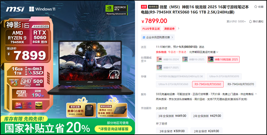 每年暑促都是玩家购机的好机会:微星神影16 锐龙版 2025在AMD锐龙9 7945HX+RTX5070配置组合首发后,再次向市场投放“重磅炸弹”:7945HX+RTX5060全新配置只需7899元,国补20%优惠后,到手价更是来到6319.2元。作为一款游戏性能、生产力属性都拉满的实力电竞游戏本,推荐给所有学生朋友们选购,如此价位可以获得越级般体验!
