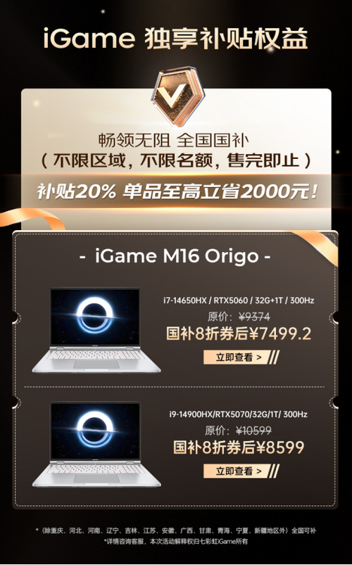 最近,消费者在购买笔记本申请国补时发现,只有少数地区才能申领国补,而且名额有限。但是有一个品牌例外,它就是七彩虹旗下高端品牌iGame,目前iGame M16 Origo游戏本京东国补是唯一可以涵盖大部分地区,并且还不限名额申领,这波iGame游戏本全网独享福利,感兴趣的小伙伴千万不要错过!