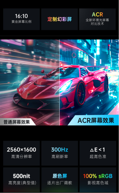 这块16英寸的大屏幕,分辨率高达2.5K,能够提供清晰细腻的显示效果。屏幕刷新率更是高达300Hz,支持100% sRGB高色域。并且还采用了ACR幻彩电竞屏,可以有效提升色彩对比和屏幕反射光,这样的屏幕配置,能够确保在玩游戏或观看视频时,画面流畅不卡顿,色彩丰富且准确。