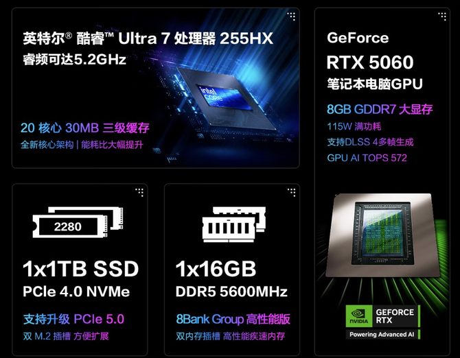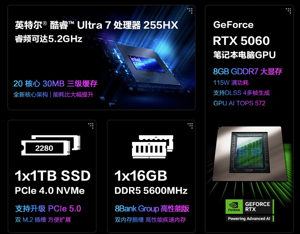 ROG魔霸新锐 2025搭载了英特尔酷睿Ultra 7 255HX处理器,加速频率高达5.2GHz,无论是处理复杂的多任务还是运行大型游戏,都能轻松应对,确保流畅无阻的使用体验。配备NVIDIA RTX 5060显卡,性能释放高达115W,支持实时光线追踪和DLSS技术,为您带来逼真的游戏画面和极致的视觉享受。无论是3A大作还是热门网游,都能轻松驾驭。更有旗舰机型同款的冰川散热架构3,0增强版,三风扇内吹+均温板+液金高效协同,使其核心总功耗可达195W,无惧高负载。此外还有16GB DDR5高速内存,搭配1TB大容量固态硬盘,不仅保证了系统的快速响应,还提供了充足的存储空间,让您无需担心游戏和文件的存放问题。
