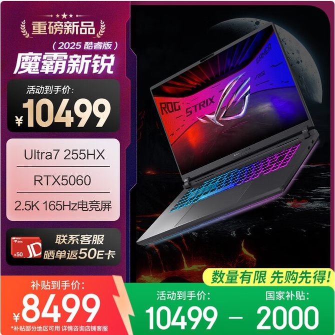 ROG魔霸新锐 2025款游戏本以其卓越的硬件配置与性能表现成为了游戏玩家和日常办公用户的理想选择。而在售价方面,U7 255HX + RTX 5060 的版本售价 10999元,国补并叠加优惠券后的到手价为 8499元。