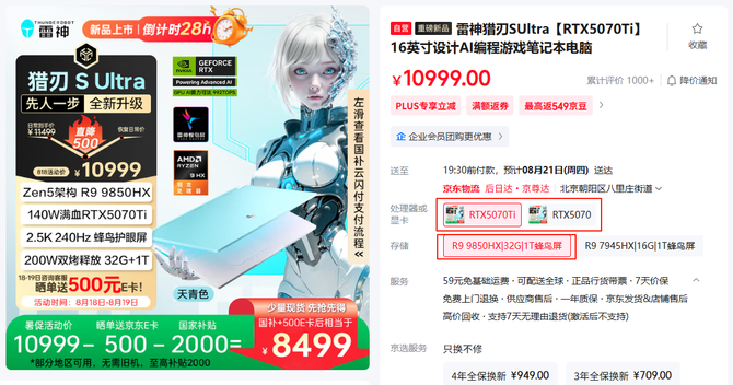 雷神猎刃Ultra也有两款机型参与活动。它们分别搭载了锐龙9 9850HX处理器,同样是采用创新的Zen 5架构,领先的4nm工艺,拥有12颗超大核心24线程,高速缓存76MB,最高加速频率5.2GHz,独立显卡则分为115W的RTX 5070和140W的RTX 5070Ti Laptop。根据显卡配置的不同,双烤性能分为180W和200W,足够流畅体验各种电竞网游和大型3A。天青色的机身设计,颜值,性能、性价比和优质便捷的售后服务都是其突出卖点。