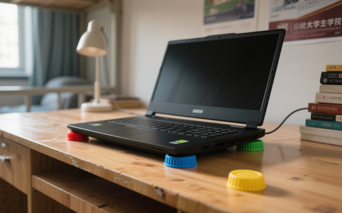 利用瓶盖,把游戏本垫高,让游戏本的下方空气可以正常流通,从而实现辅助散热的效果。相信这是不少学生党们当年都用过的散热小妙招,好处就是方便易操作,但是不能有太大的动作,不然游戏本很容易“翻车”。