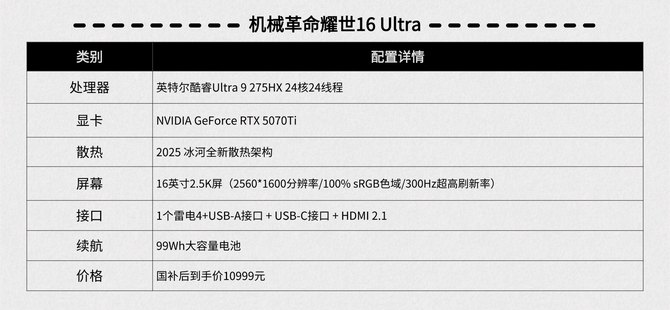 如果是预算相对充足的用户,想要在配置上再上一个档次,那么就可以看看这款机械革命耀世16 Ultra,机械革命的性价比是有目共睹的,这款游戏本采用Ultra 9 275HX+RTX 5070 Ti的旗舰组合,国补到手价10999元,在同级别当中价格优势是很明显的。
