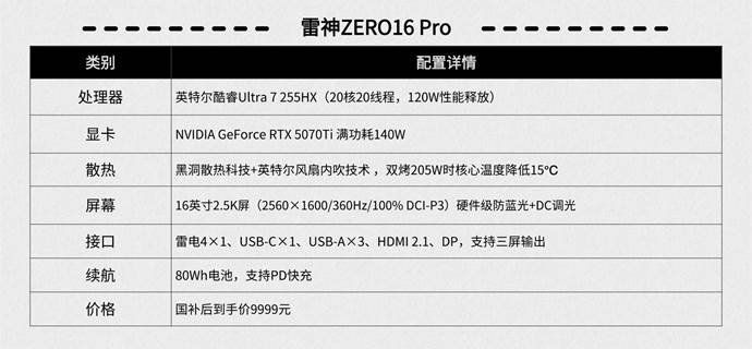 配置上,雷神ZERO16 Pro采用酷睿Ultra 7 255HX处理器与RTX 5070 Ti笔记本电脑GPU的强力组合,在游戏场景表现游刃有余,借助英特尔风扇内吹技术加持的黑洞散热架构,其核心温度可降低15℃,确保长时间高负荷运行时依然保持稳定性能输出。