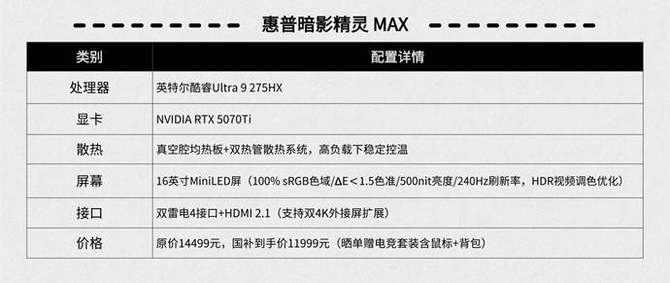 这时你就可以选择惠普暗影精灵MAX,它不仅搭载酷睿Ultra 9 275HX处理器和RTX 5070 Ti显卡,而且配备了MiniLED屏幕,画质表现更为突出。