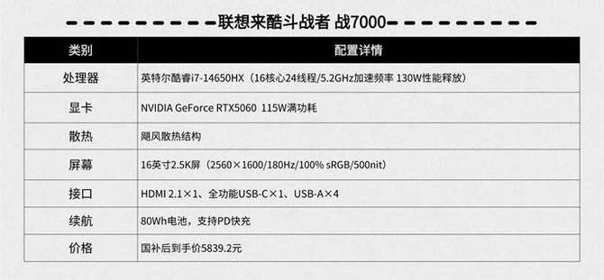 最后,再给大家介绍一款价格超低非常超值的游戏本,就是联想来酷斗战者 战7000,它采用i7-14650HX处理器,显卡为RTX 5060,拥有200W的性能释放,同样可以满足大家对于游戏的需求。