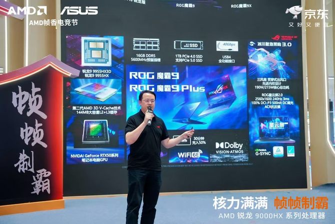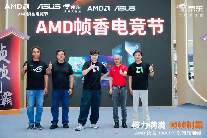 AMD大中华区销售副总裁晁亚新、AMD大中华区市场营销副总裁纪朝晖、华硕电脑系统平台渠道运营中心总监林桀民,京东笔记本业务部华硕组负责人,知名游戏主播“老飞宇66”共同登台为“AMD帧香电竞节” 揭幕。